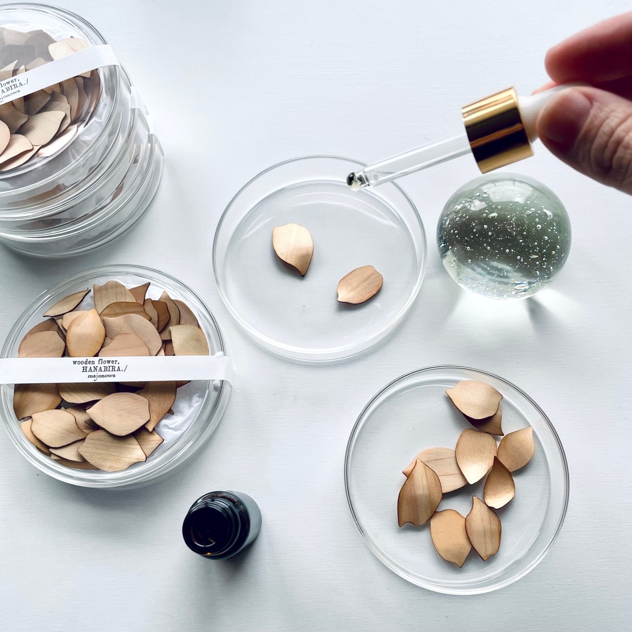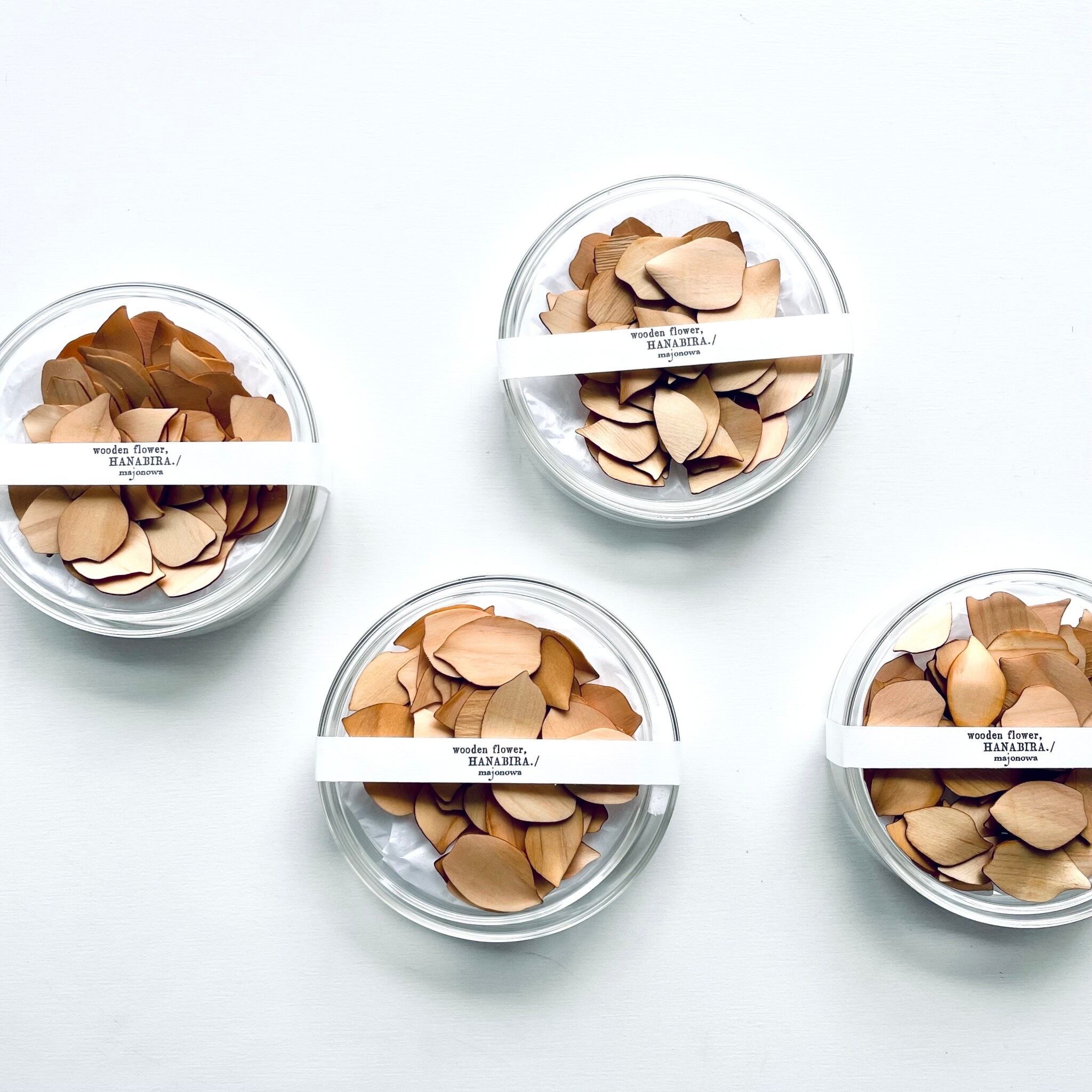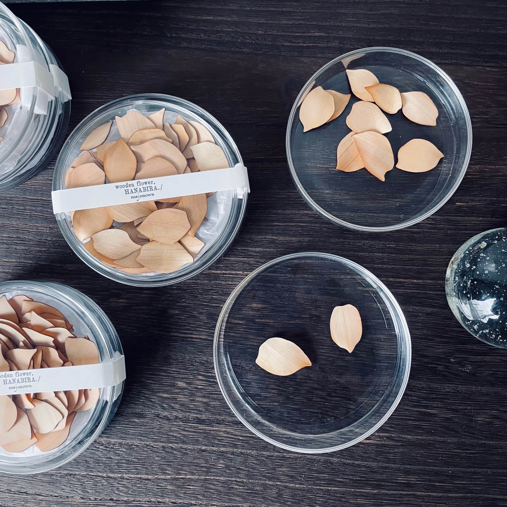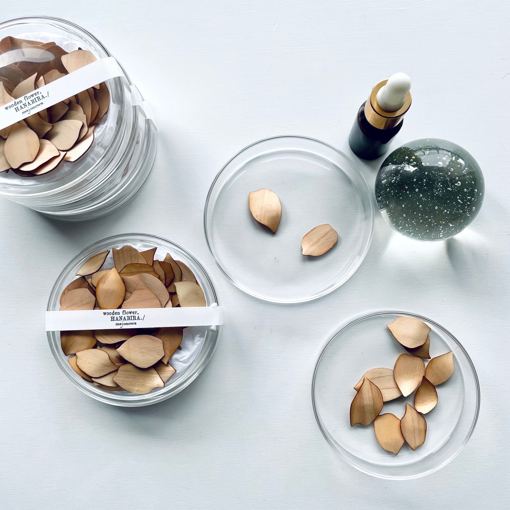 枚数:1つのガラスシャーレに約60枚の木の花びらが入っています。